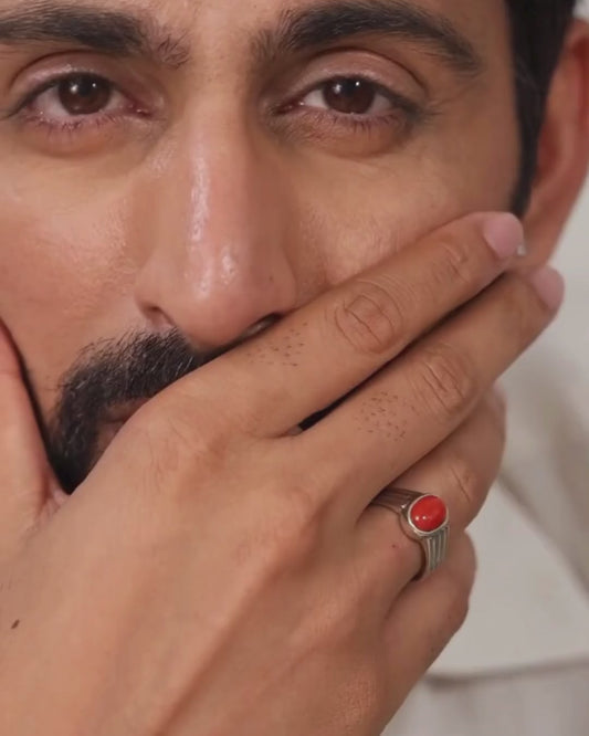 Red Coral is traditionally worn on the ring finger of the right hand. Recommended metals include gold, silver, or 18k gold.