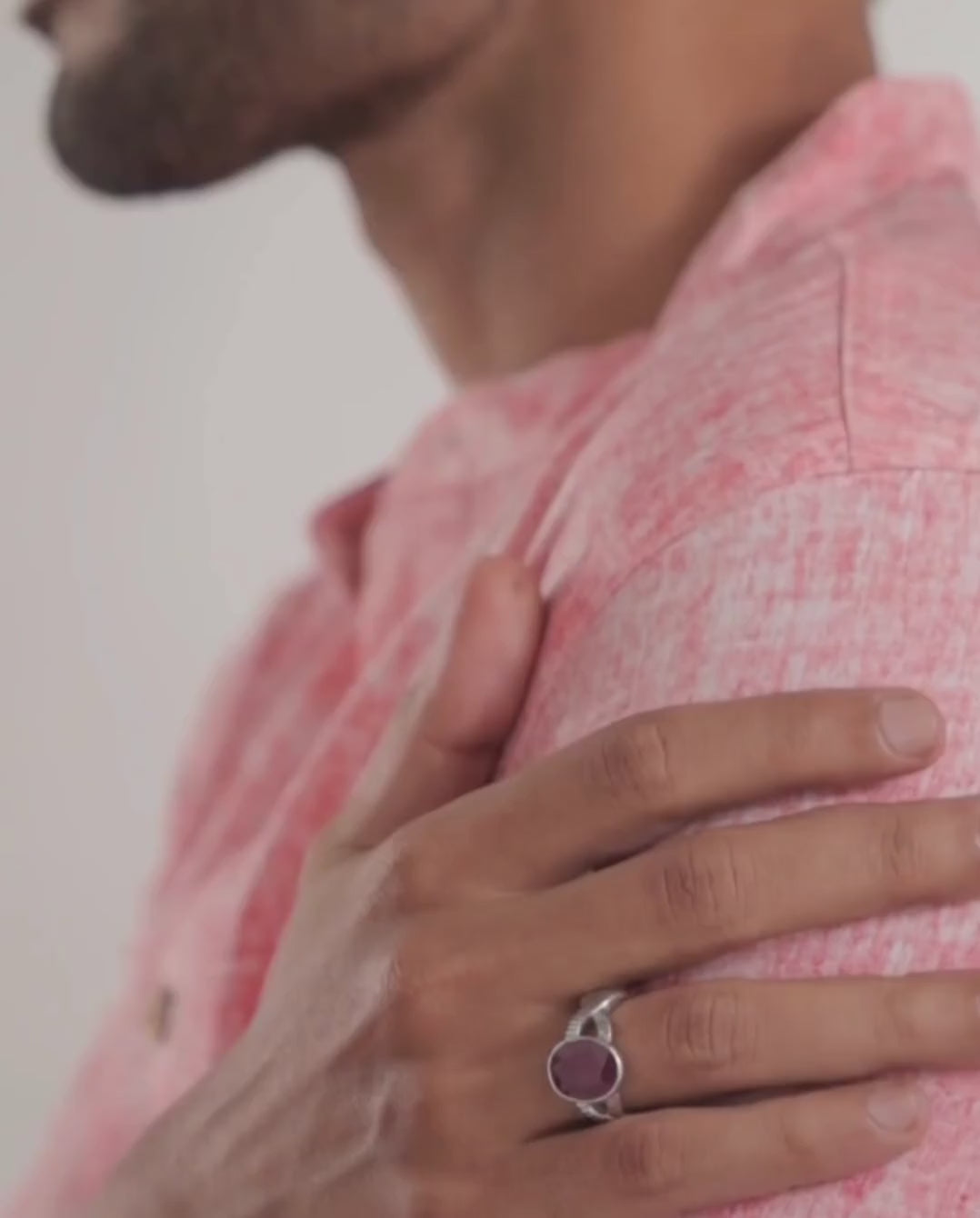 Pure and captivating, our ruby ring is a tribute to the timeless allure of this precious gemstone. Set in 925 sterling silver, the ruby—known as Ratnaraj, or 'King of Gems'—boasts rich crimson shades with soft pink undertones. Its emotional resonance and bold beauty make it truly unique. Crafted to touch your skin, this ring delivers unparalleled astrological benefits with 100% authentic ruby brilliance.