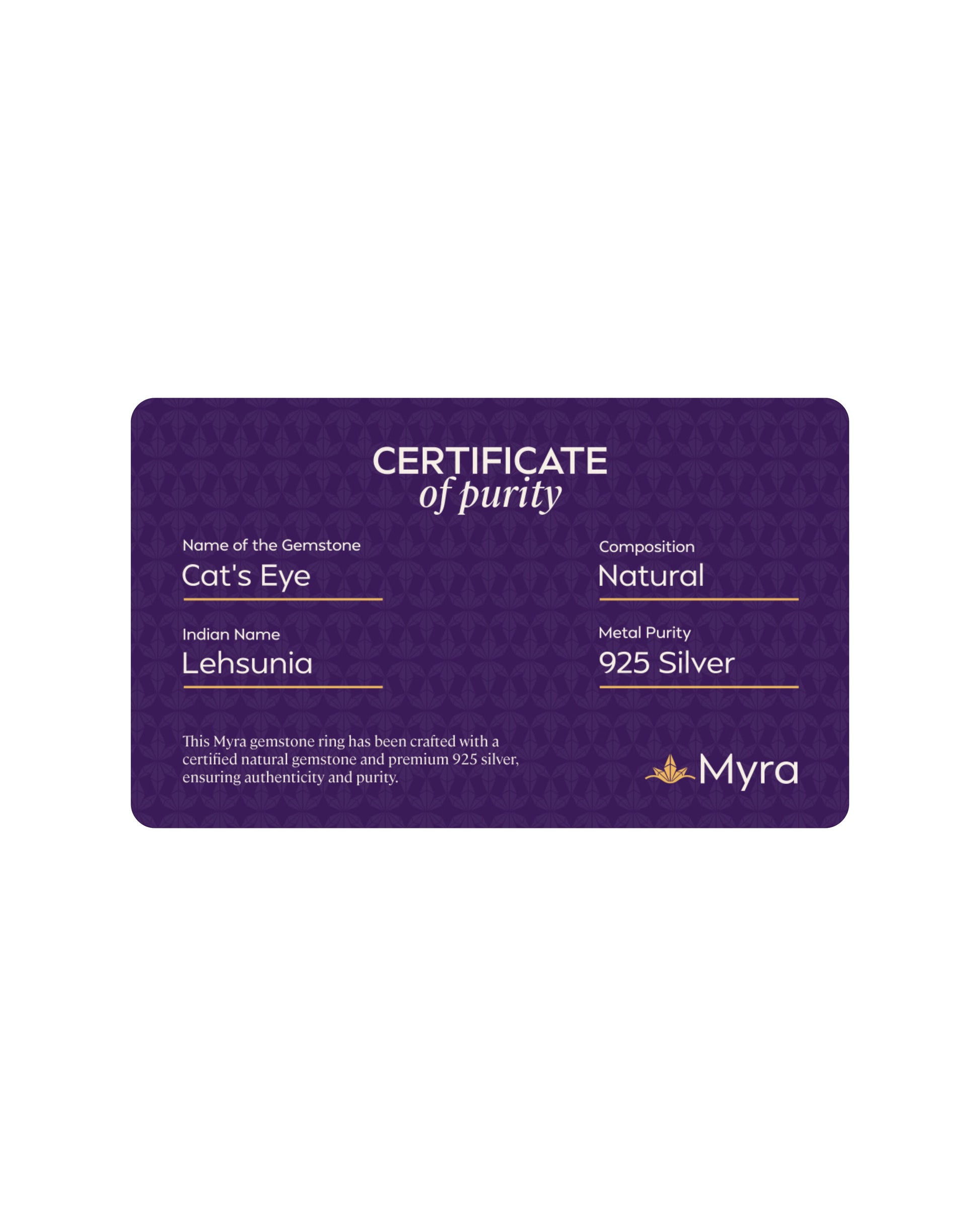 Mystical protection meets timeless purity in our Cat’s Eye (Lehsunia) ring, crafted in 925 sterling silver. With its unique light-reflecting streak that resembles a feline eye, this rare gemstone is revered for warding off negativity and enhancing intuition. Carefully designed to touch your skin, the ring is made using traditional astrological methods and showcases 100% natural Cat’s Eye, offering clarity and spiritual protection in an elegant form.