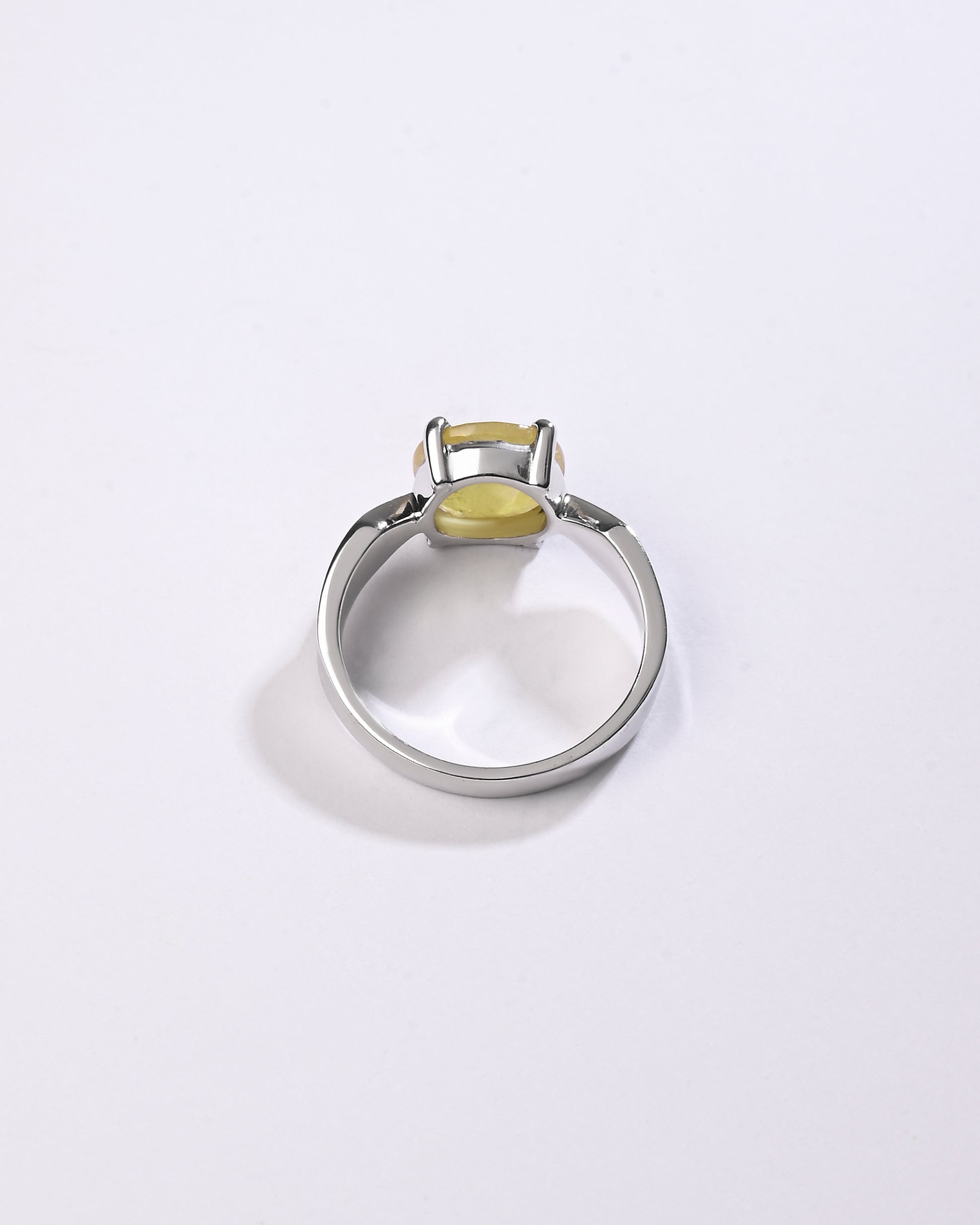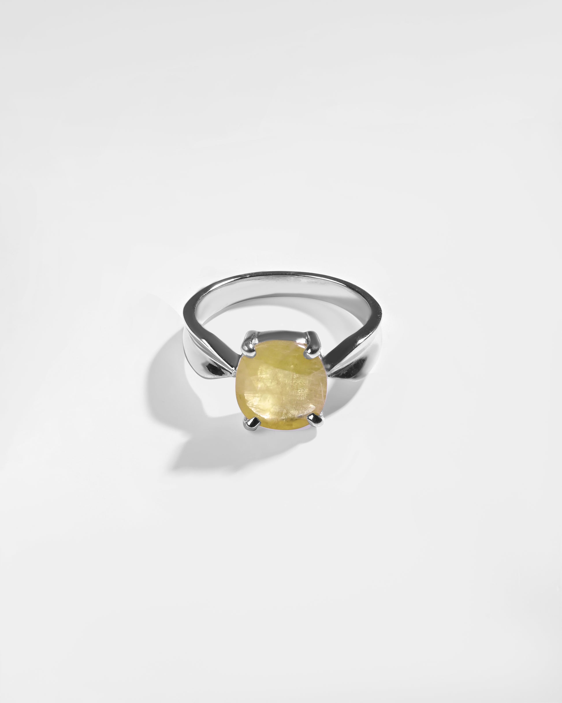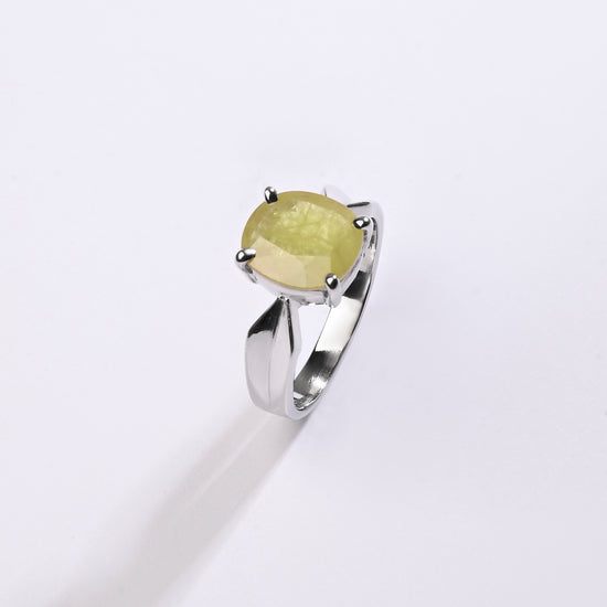 Radiating purity and brilliance, our yellow sapphire ring is set in 925 sterling silver. Known for its golden shimmer, this exquisite gemstone reflects light beautifully, creating a warm and radiant glow. Believed to attract prosperity and success, yellow sapphire is thoughtfully designed to touch your skin, enhancing its astrological energy. Celebrate the perfect blend of elegance and authenticity with a 100% genuine yellow sapphire.
