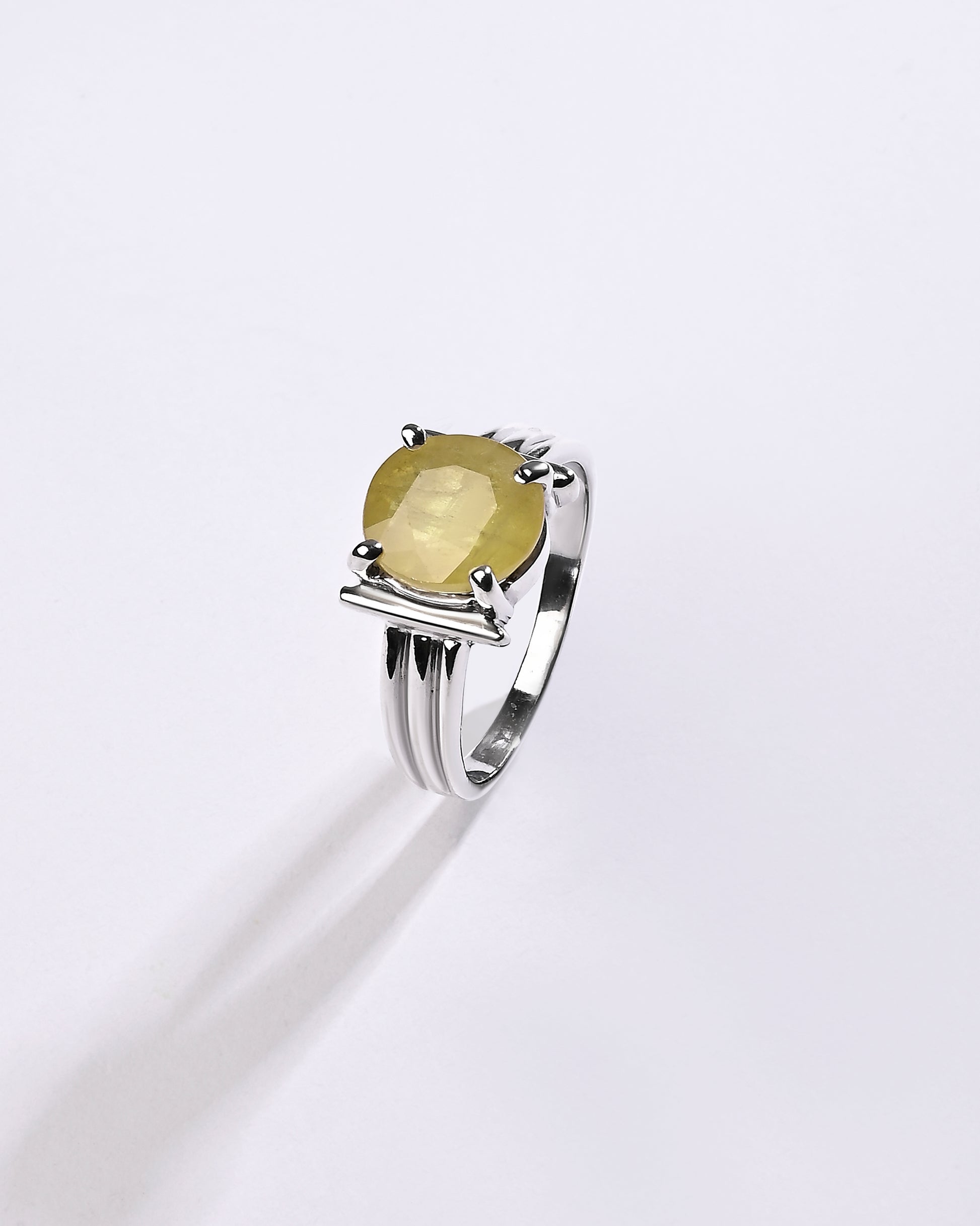 Radiating purity and brilliance, our yellow sapphire ring is set in 925 sterling silver. Known for its golden shimmer, this exquisite gemstone reflects light beautifully, creating a warm and radiant glow. Believed to attract prosperity and success, yellow sapphire is thoughtfully designed to touch your skin, enhancing its astrological energy. Celebrate the perfect blend of elegance and authenticity with a 100% genuine yellow sapphire.