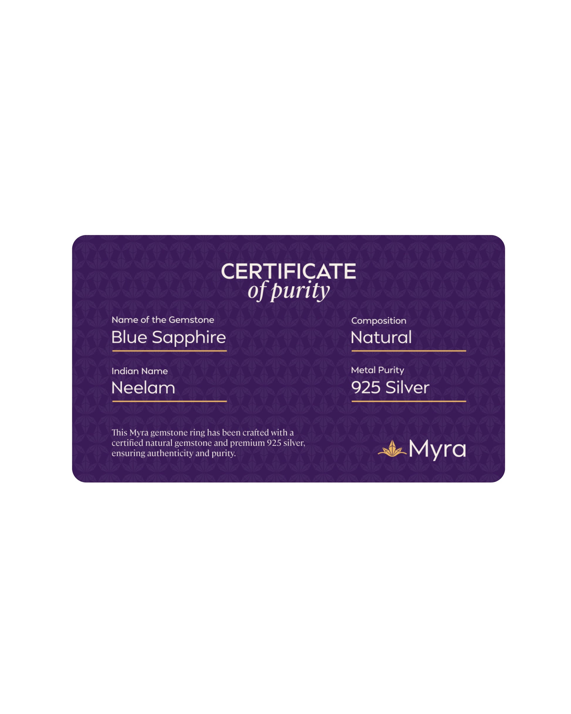 Each Myra ring includes a Brand Certificate verifying authenticity, natural origin, gemstone details and guarantee card ensuring complete transparency and trust.