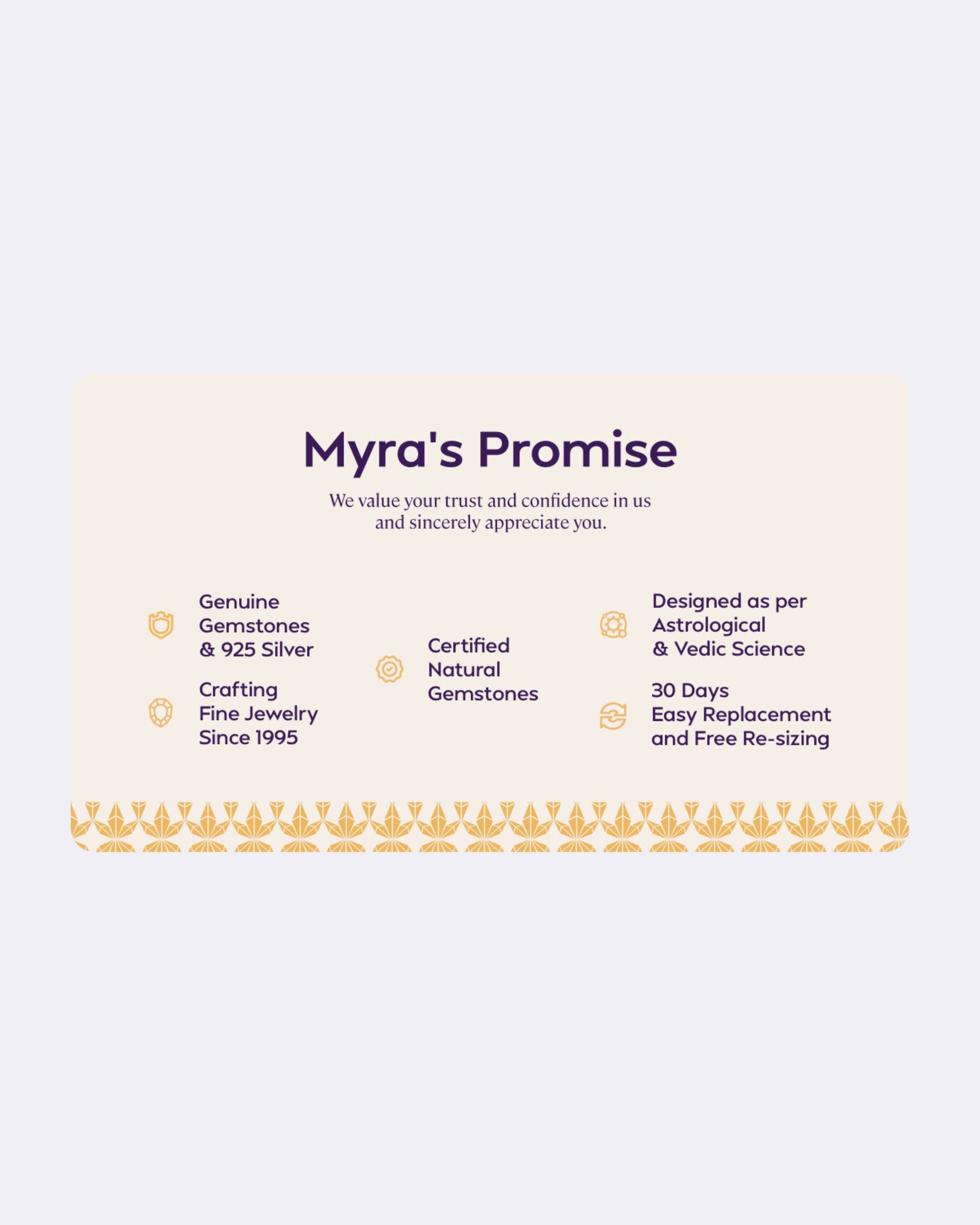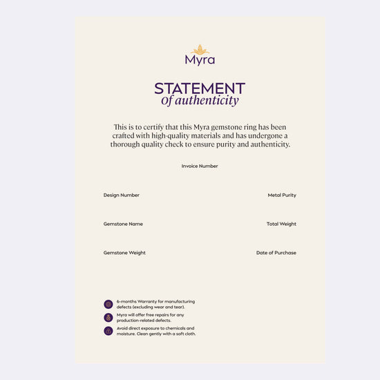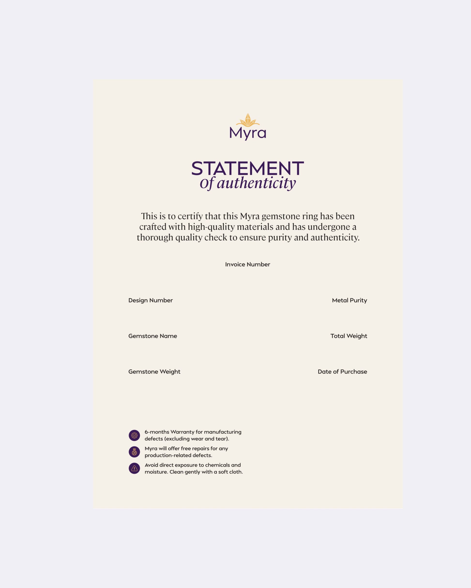 Each Myra ring includes a Brand Certificate verifying authenticity, natural origin, gemstone details and guarantee card ensuring complete transparency and trust.