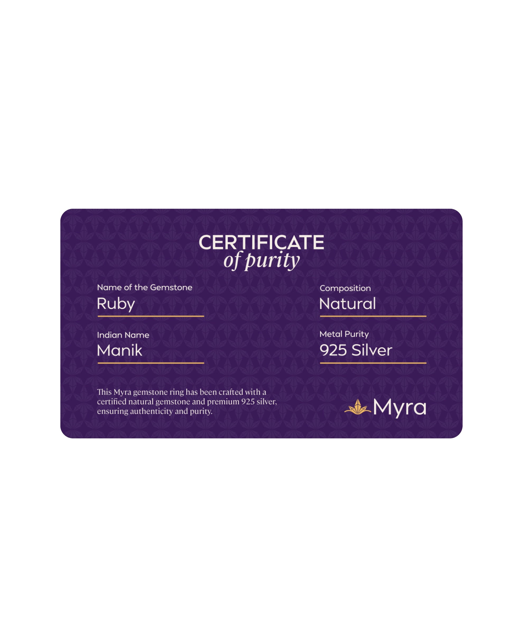 Each Myra ring includes a Brand Certificate verifying authenticity, natural origin, gemstone details and guarantee card ensuring complete transparency and trust.
