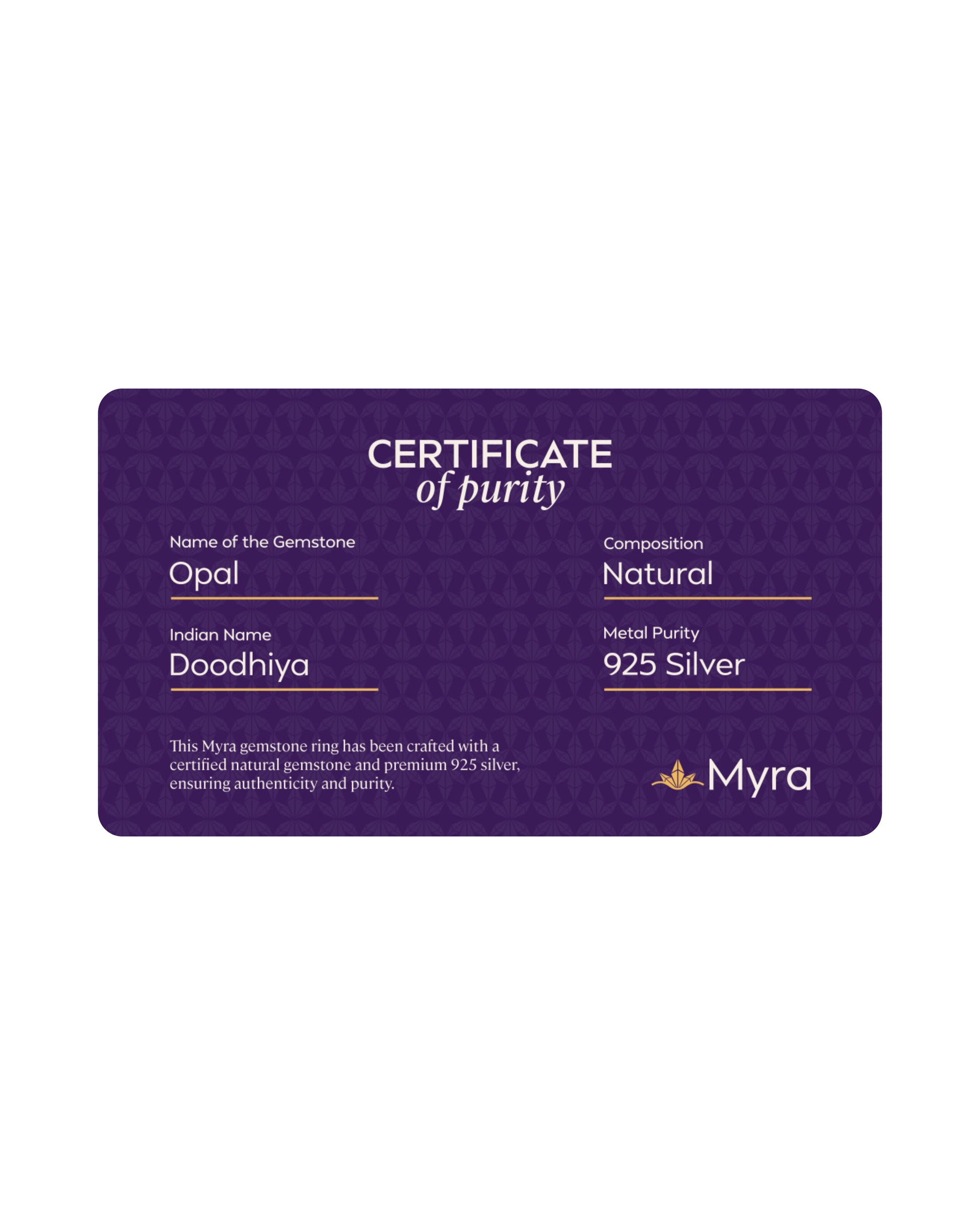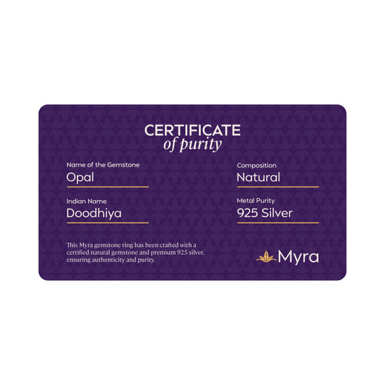 Each Myra ring includes a Brand Certificate verifying authenticity, natural origin, gemstone details and guarantee card ensuring complete transparency and trust.