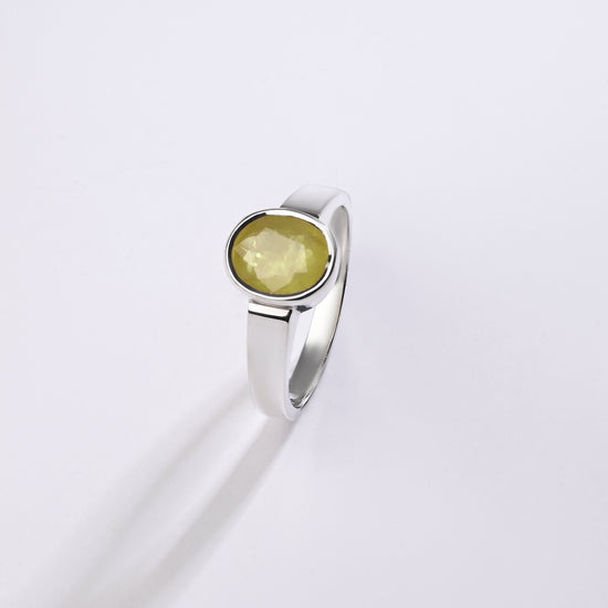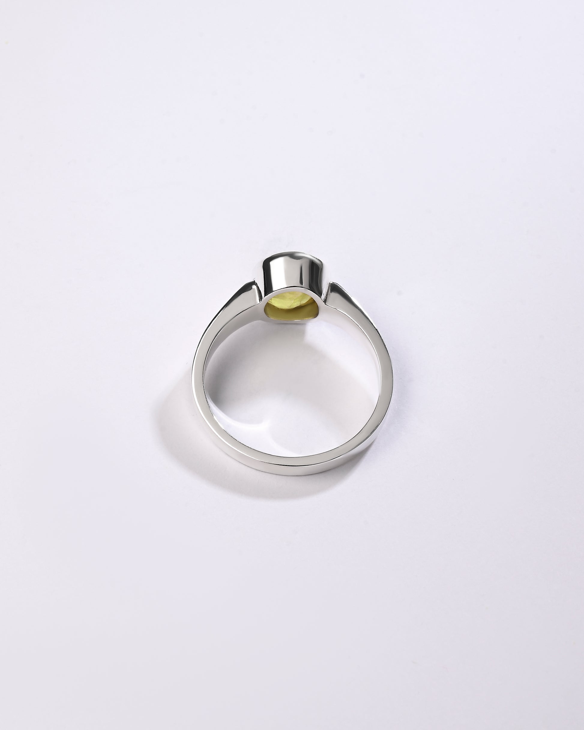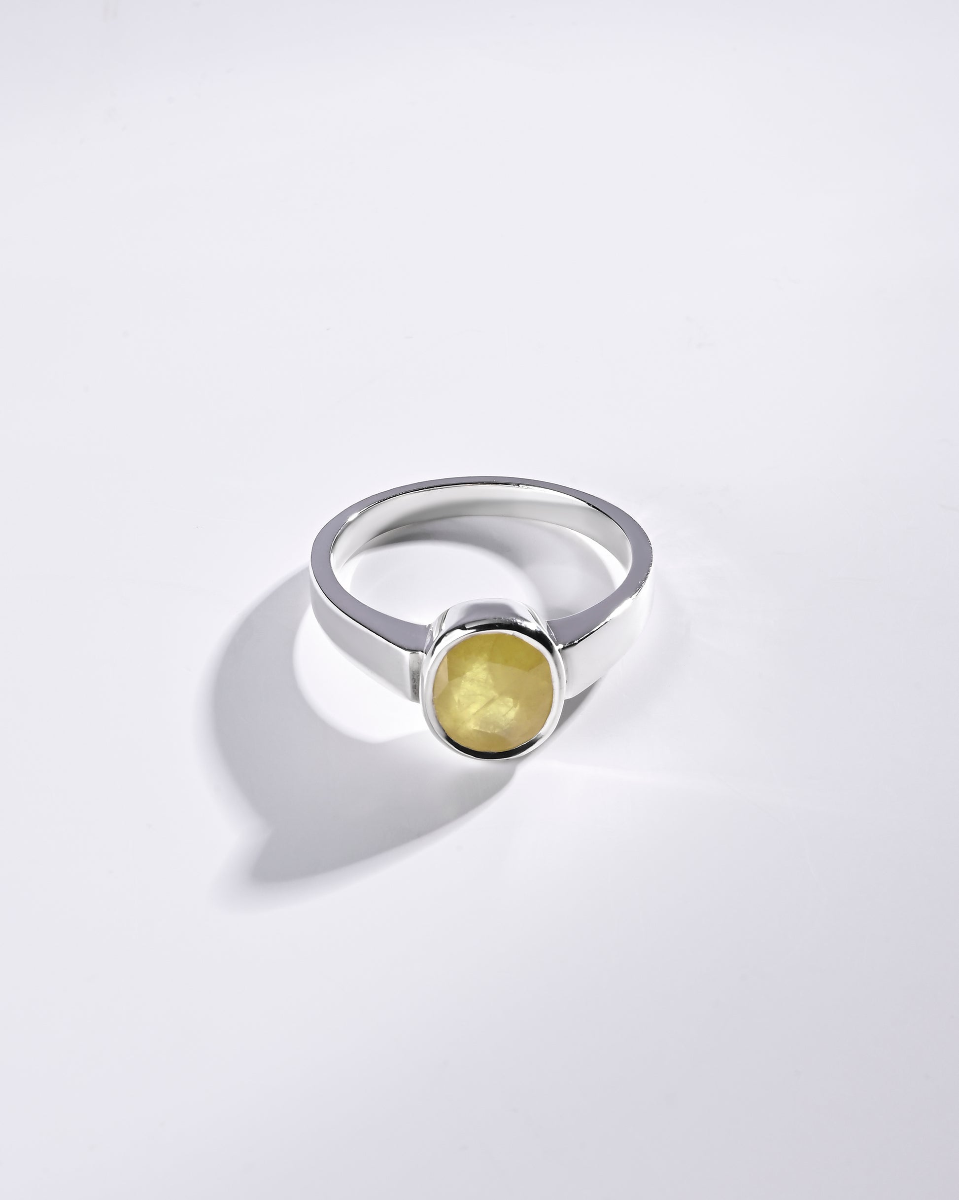 Radiating purity and brilliance, our yellow sapphire ring is set in 925 sterling silver. Known for its golden shimmer, this exquisite gemstone reflects light beautifully, creating a warm and radiant glow. Believed to attract prosperity and success, yellow sapphire is thoughtfully designed to touch your skin, enhancing its astrological energy. Celebrate the perfect blend of elegance and authenticity with a 100% genuine yellow sapphire.