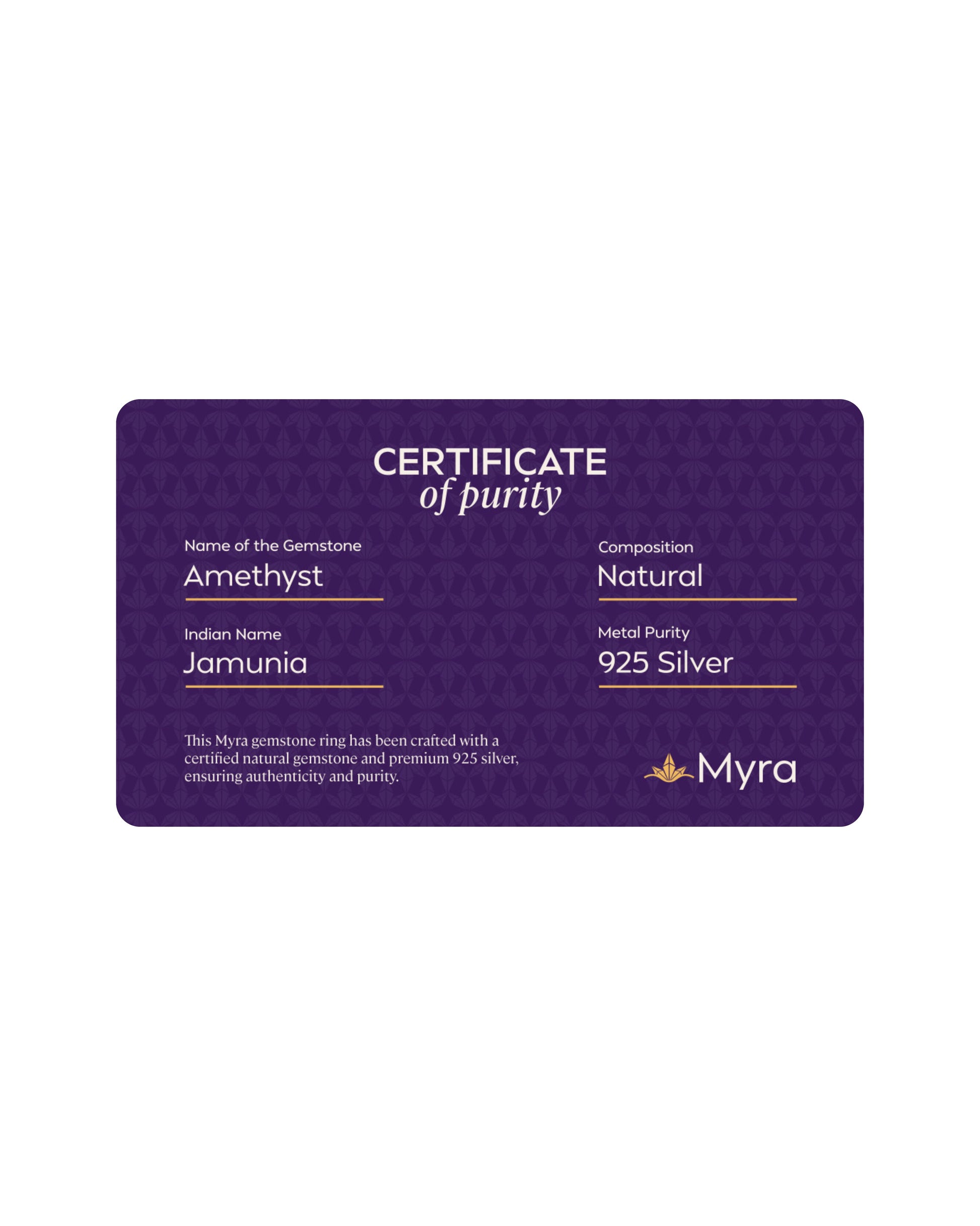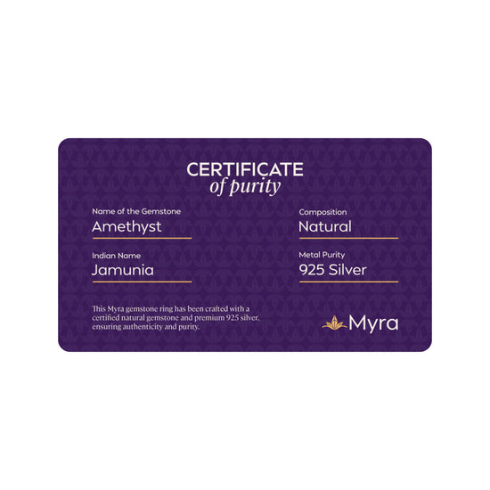 Each Myra ring includes a Brand Certificate verifying authenticity, natural origin, gemstone details and guarantee card ensuring complete transparency and trust.
