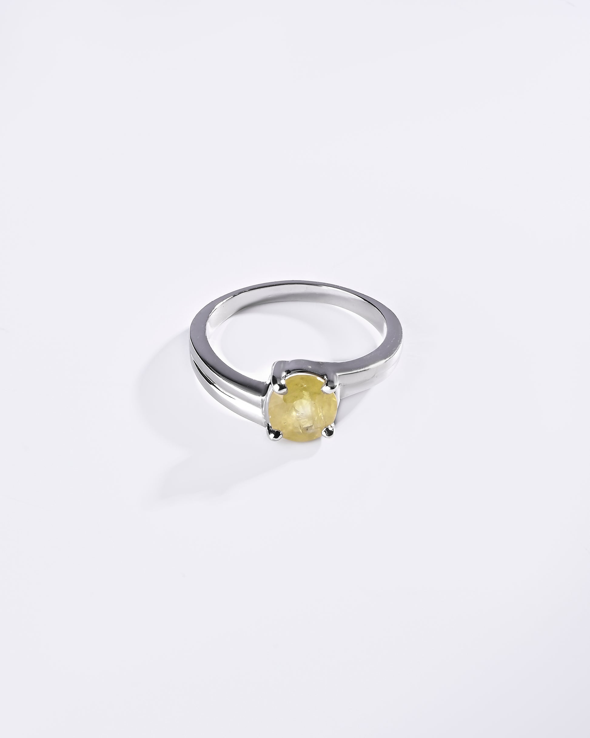 Radiating purity and brilliance, our yellow sapphire ring is set in 925 sterling silver. Known for its golden shimmer, this exquisite gemstone reflects light beautifully, creating a warm and radiant glow. Believed to attract prosperity and success, yellow sapphire is thoughtfully designed to touch your skin, enhancing its astrological energy. Celebrate the perfect blend of elegance and authenticity with a 100% genuine yellow sapphire.