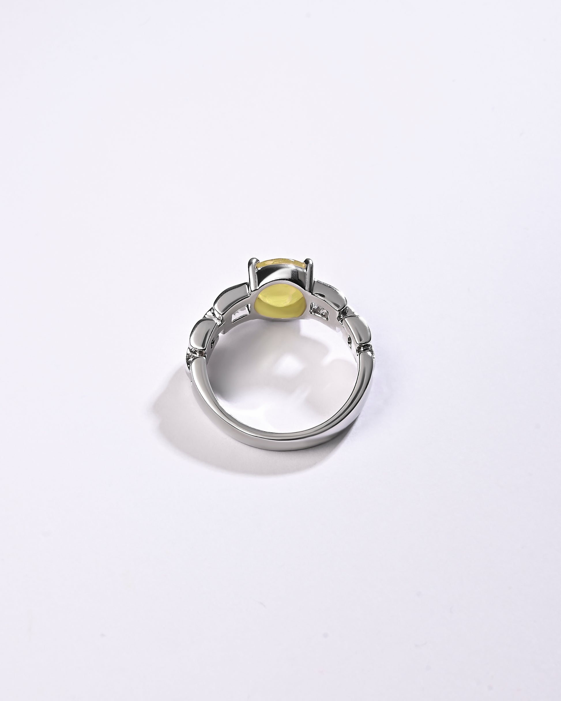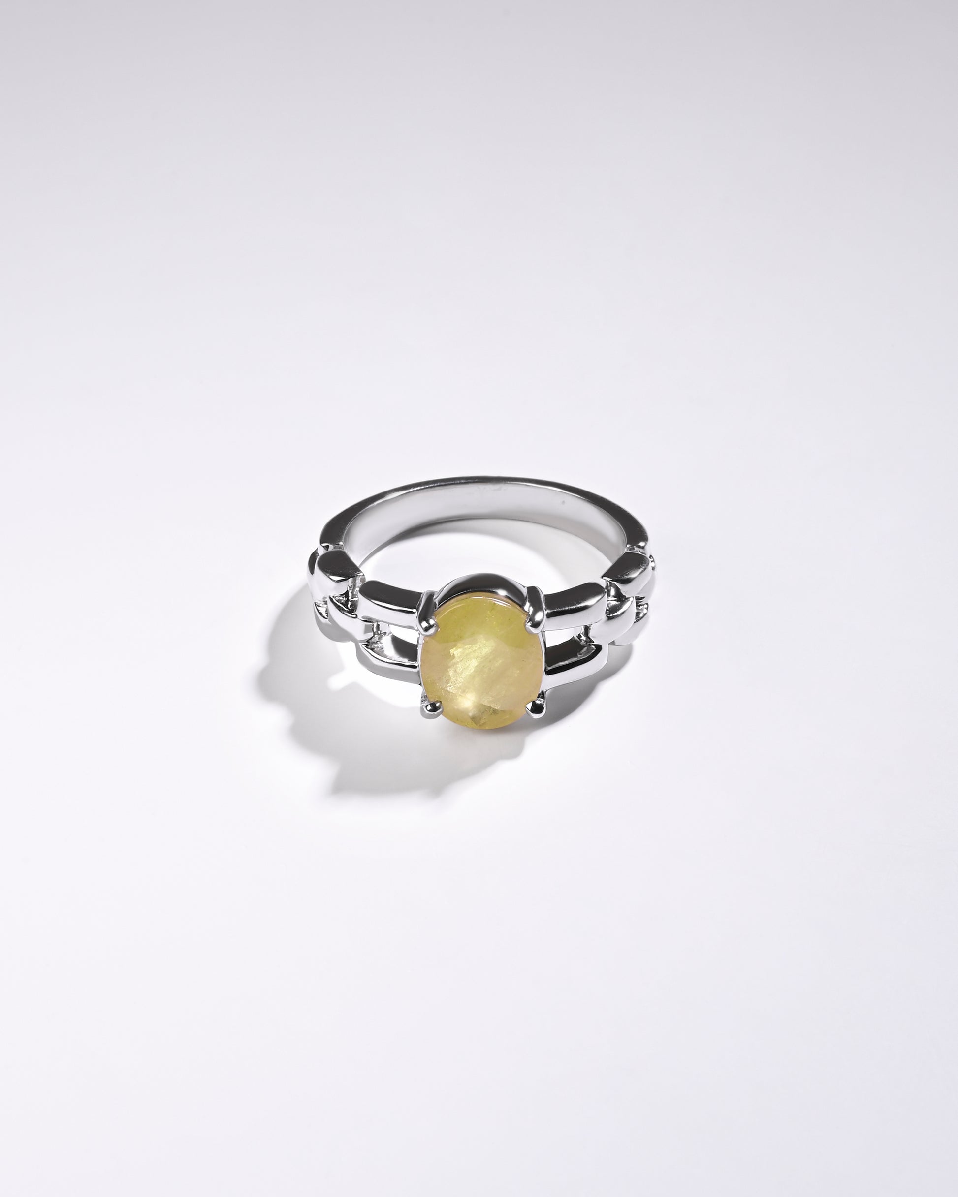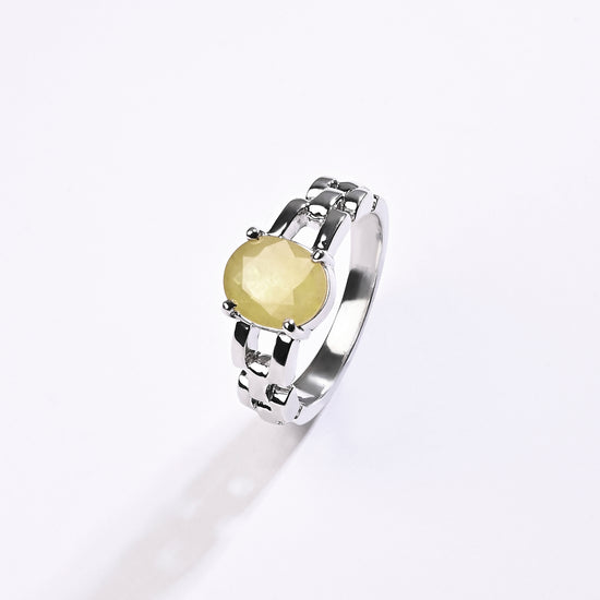 Radiating purity and brilliance, our yellow sapphire ring is set in 925 sterling silver. Known for its golden shimmer, this exquisite gemstone reflects light beautifully, creating a warm and radiant glow. Believed to attract prosperity and success, yellow sapphire is thoughtfully designed to touch your skin, enhancing its astrological energy. Celebrate the perfect blend of elegance and authenticity with a 100% genuine yellow sapphire.