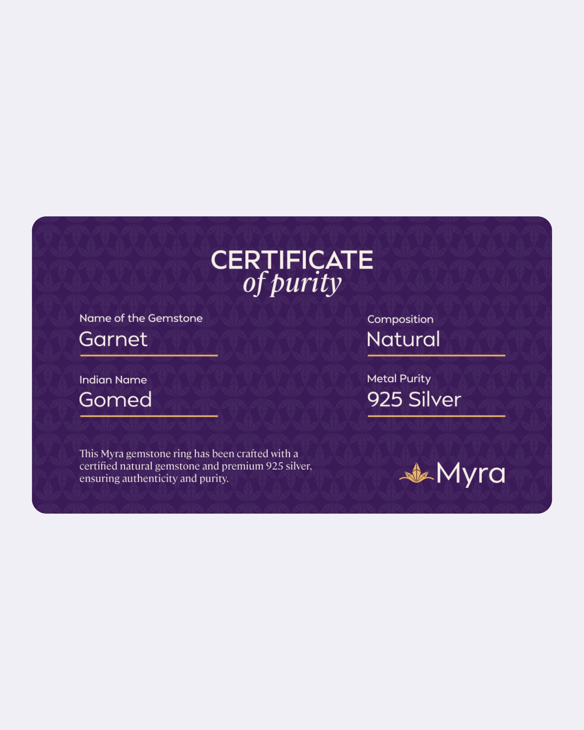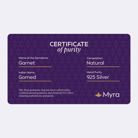 Each Myra ring includes a Brand Certificate verifying authenticity, natural origin, gemstone details and guarantee card ensuring complete transparency and trust.