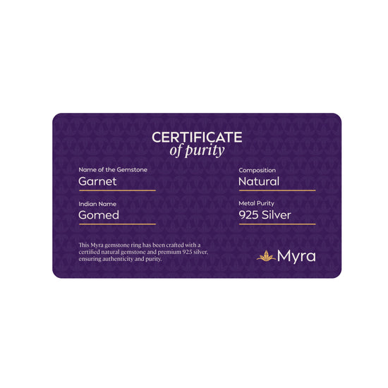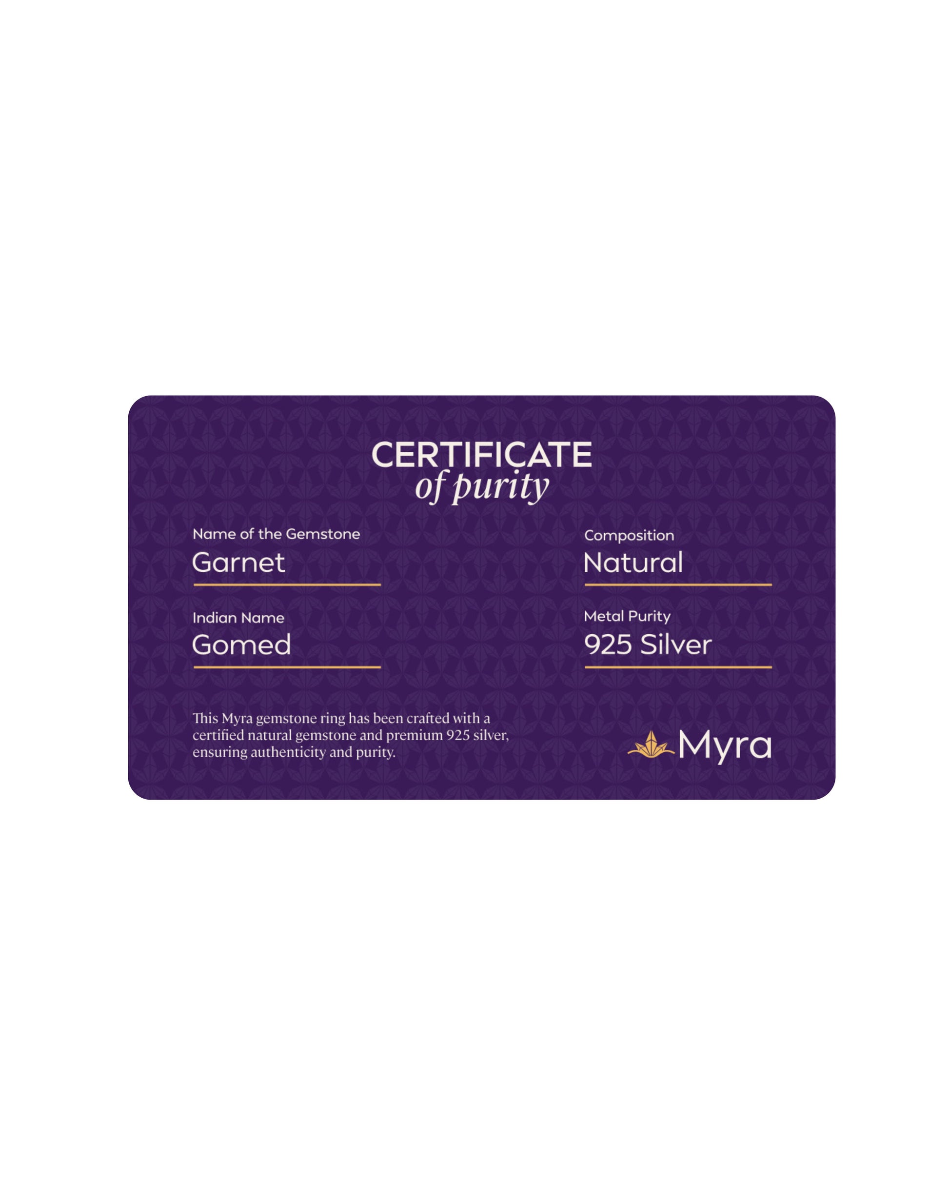 Each Myra ring includes a Brand Certificate verifying authenticity, natural origin, gemstone details and guarantee card ensuring complete transparency and trust.