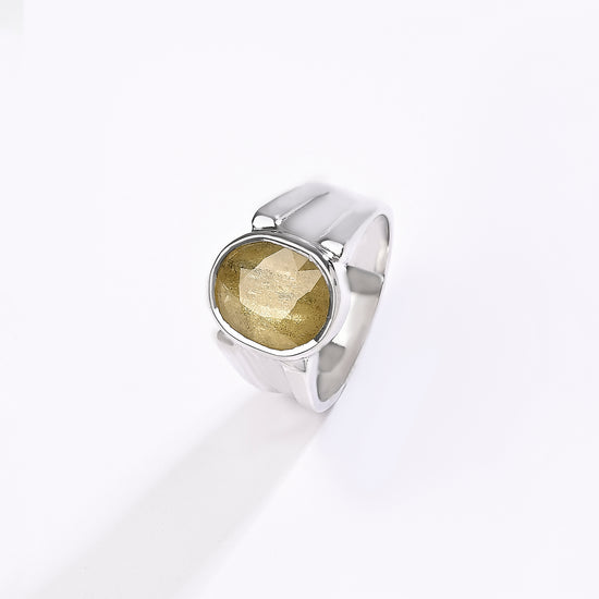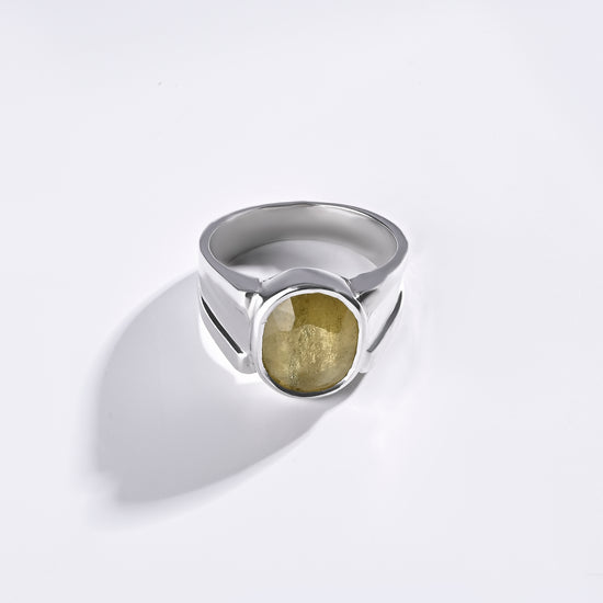 Radiating purity and brilliance, our yellow sapphire ring is set in 925 sterling silver. Known for its golden shimmer, this exquisite gemstone reflects light beautifully, creating a warm and radiant glow. Believed to attract prosperity and success, yellow sapphire is thoughtfully designed to touch your skin, enhancing its astrological energy. Celebrate the perfect blend of elegance and authenticity with a 100% genuine yellow sapphire.