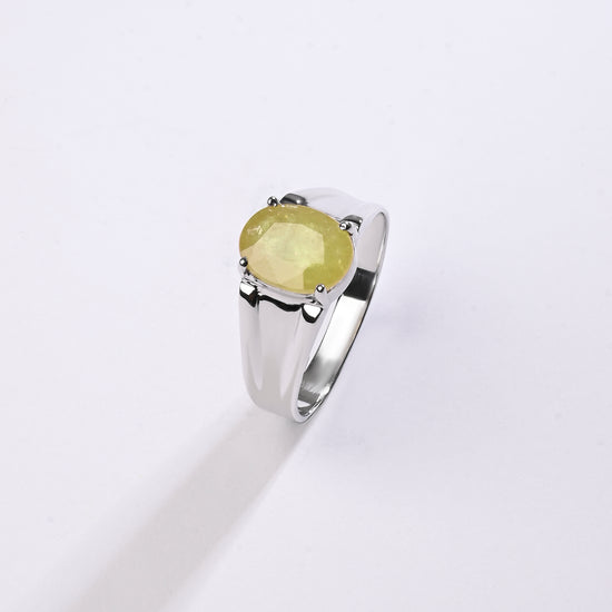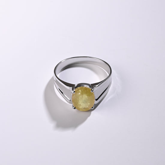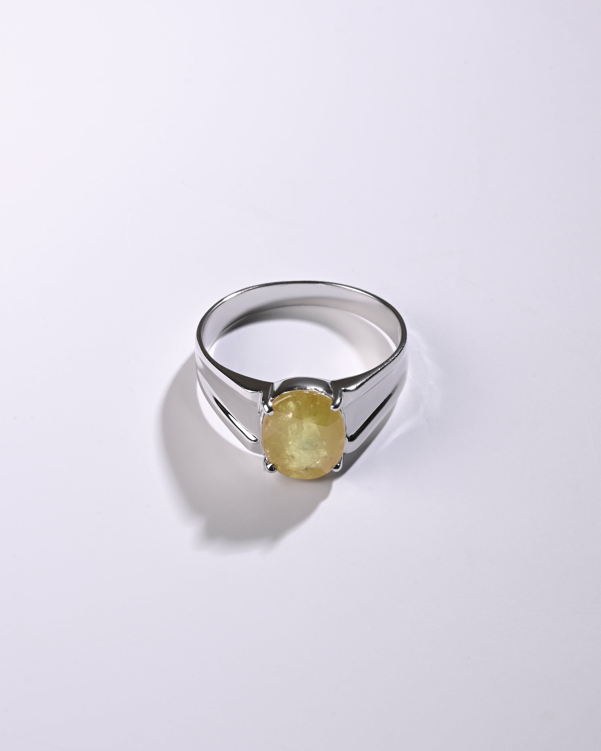 Radiating purity and brilliance, our yellow sapphire ring is set in 925 sterling silver. Known for its golden shimmer, this exquisite gemstone reflects light beautifully, creating a warm and radiant glow. Believed to attract prosperity and success, yellow sapphire is thoughtfully designed to touch your skin, enhancing its astrological energy. Celebrate the perfect blend of elegance and authenticity with a 100% genuine yellow sapphire.