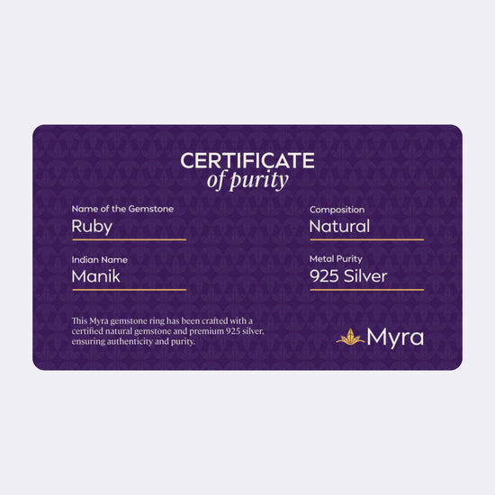 Each Myra ring includes a Brand Certificate verifying authenticity, natural origin, gemstone details and guarantee card ensuring complete transparency and trust.