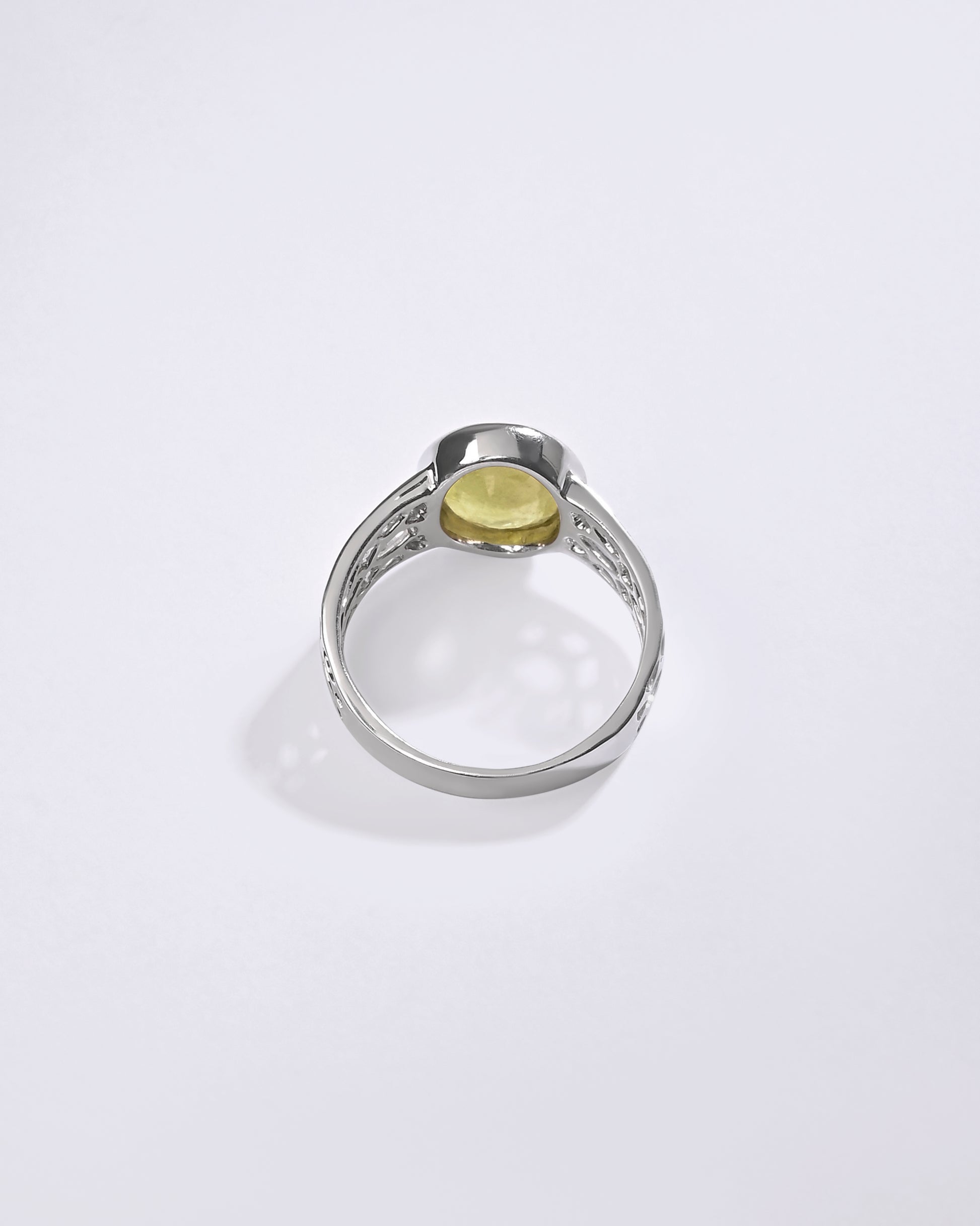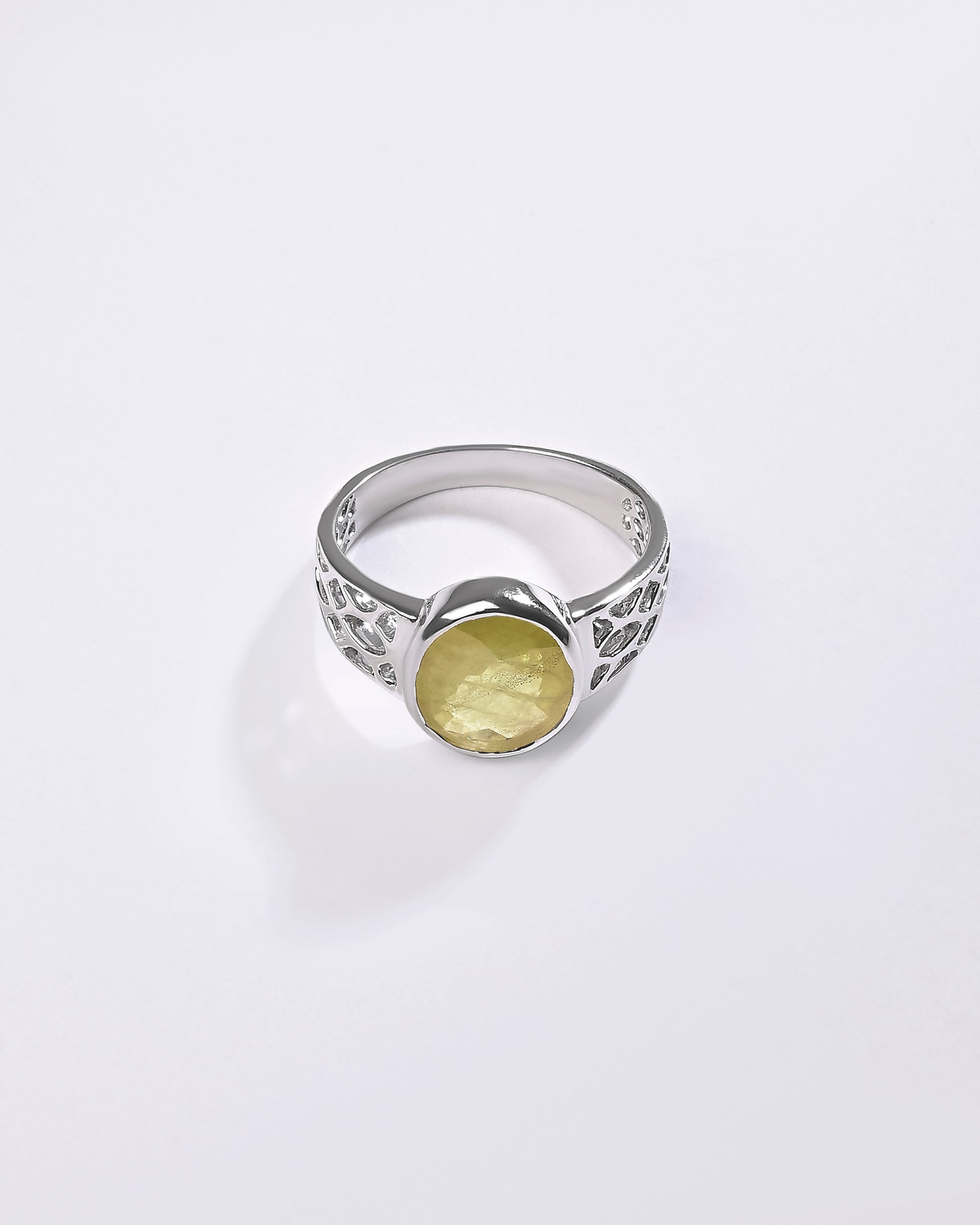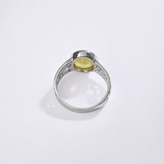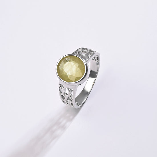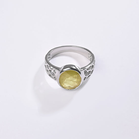 Radiating purity and brilliance, our yellow sapphire ring is set in 925 sterling silver. Known for its golden shimmer, this exquisite gemstone reflects light beautifully, creating a warm and radiant glow. Believed to attract prosperity and success, yellow sapphire is thoughtfully designed to touch your skin, enhancing its astrological energy. Celebrate the perfect blend of elegance and authenticity with a 100% genuine yellow sapphire.