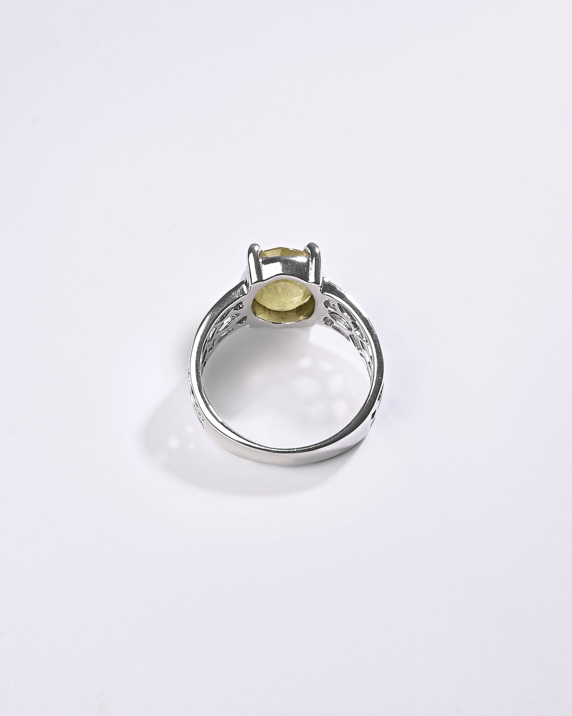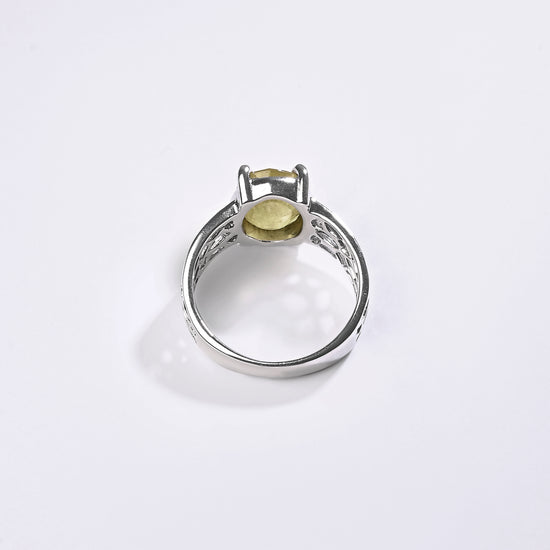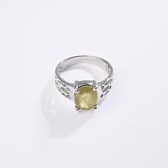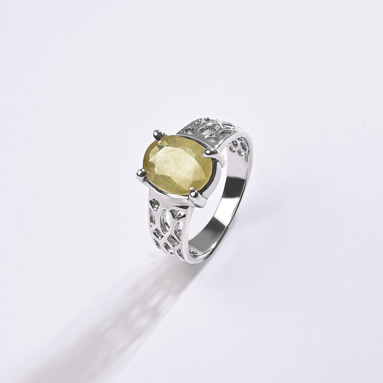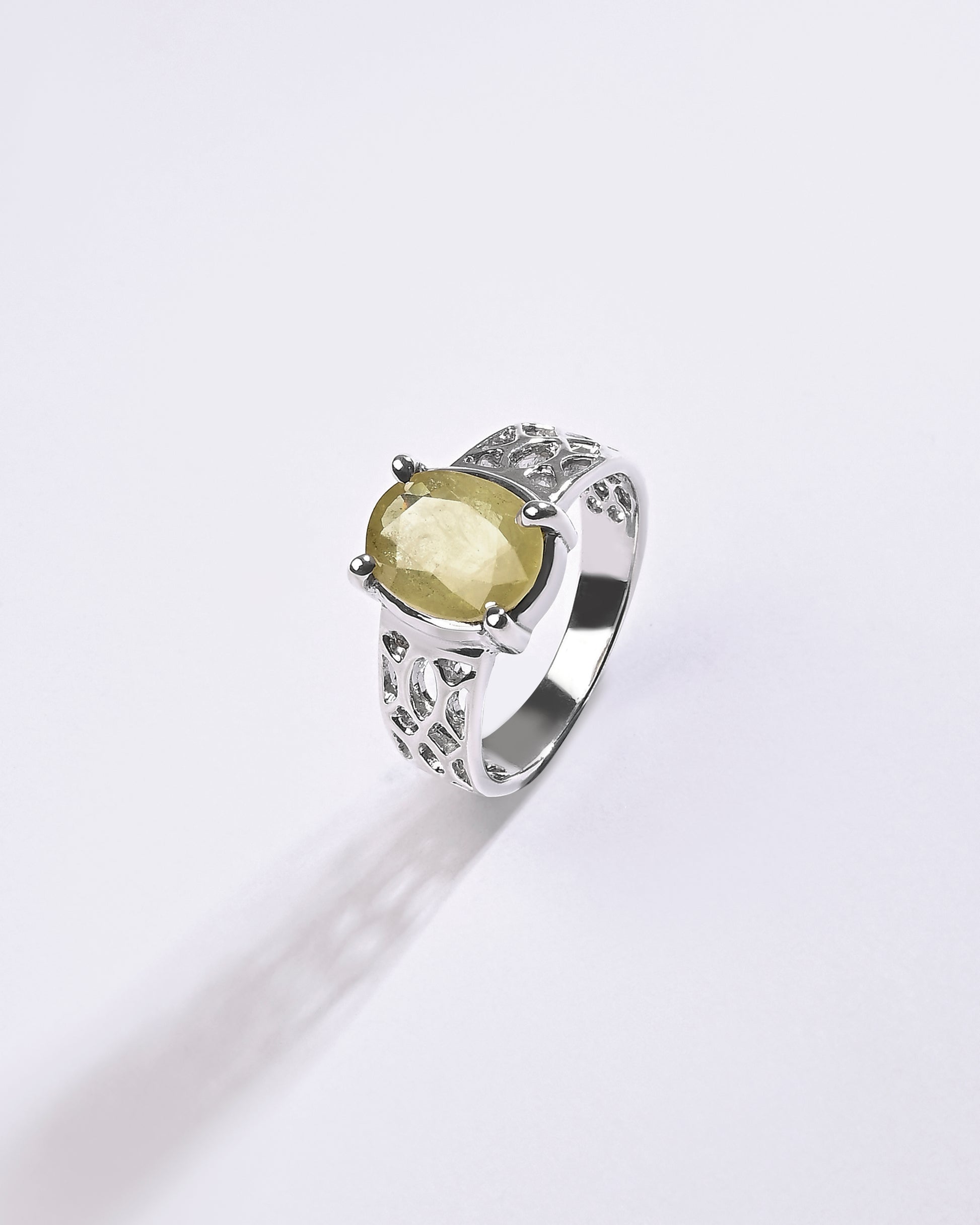 Radiating purity and brilliance, our yellow sapphire ring is set in 925 sterling silver. Known for its golden shimmer, this exquisite gemstone reflects light beautifully, creating a warm and radiant glow. Believed to attract prosperity and success, yellow sapphire is thoughtfully designed to touch your skin, enhancing its astrological energy. Celebrate the perfect blend of elegance and authenticity with a 100% genuine yellow sapphire.