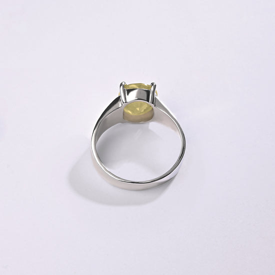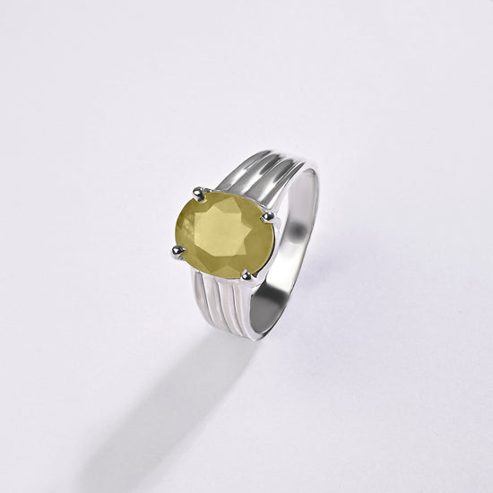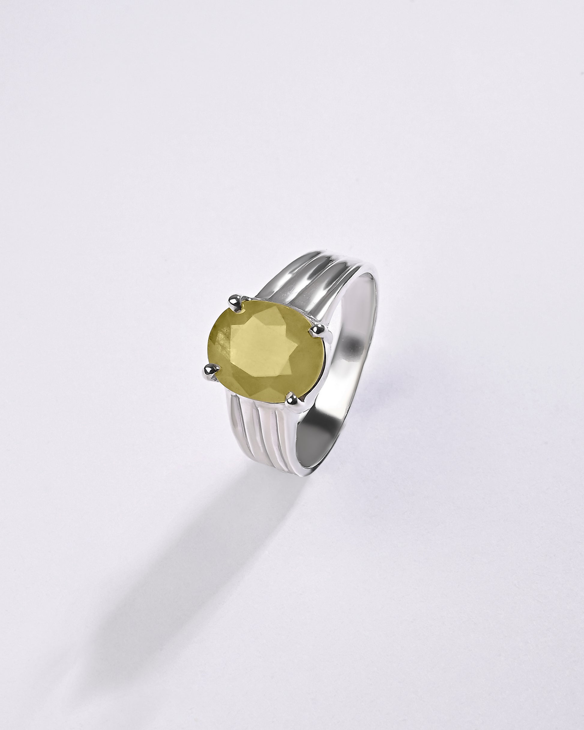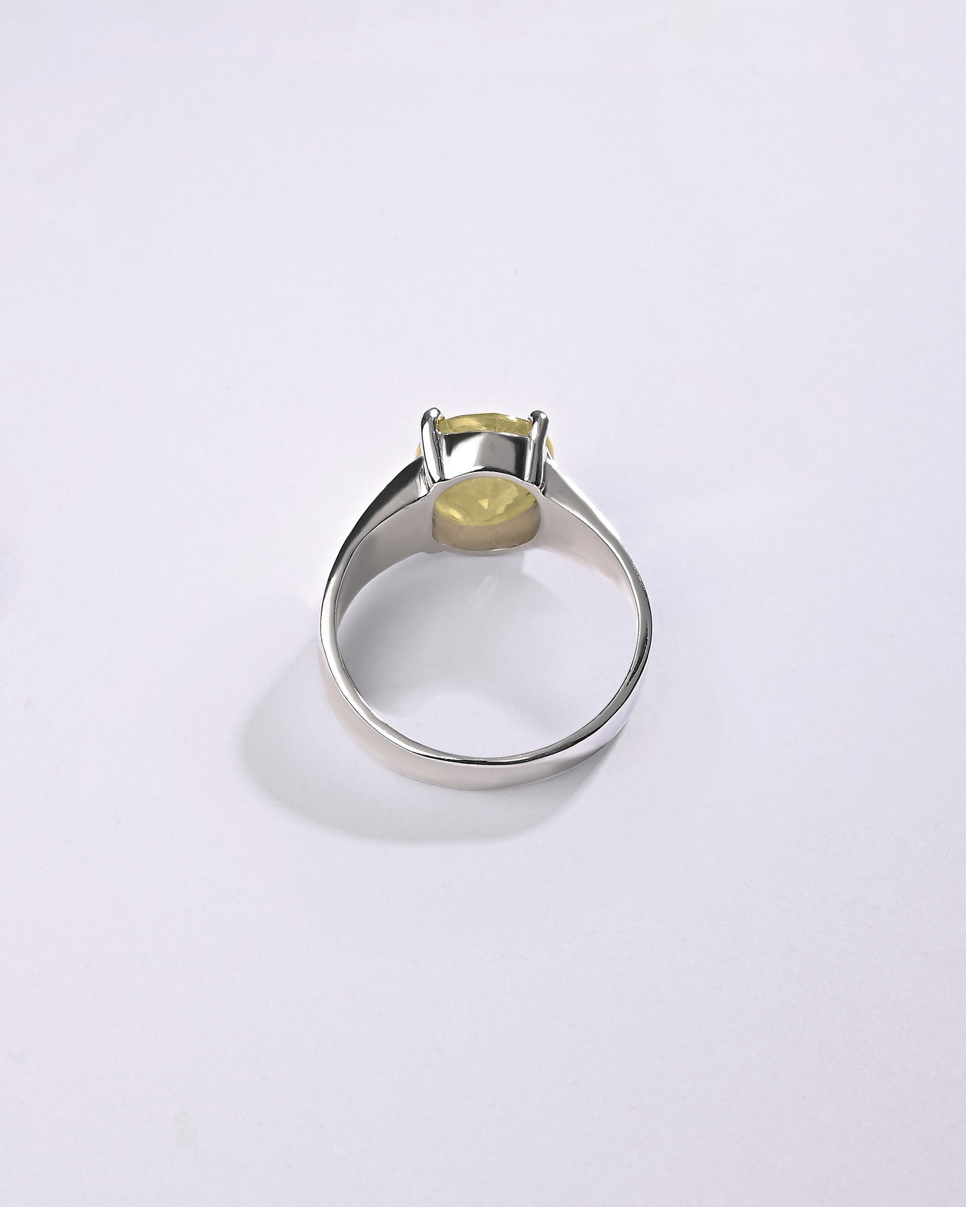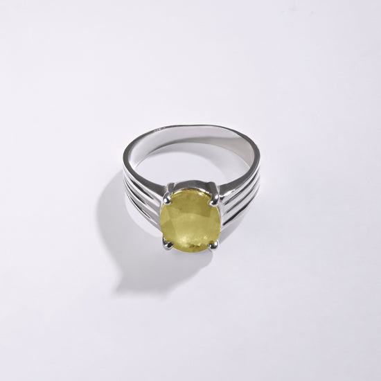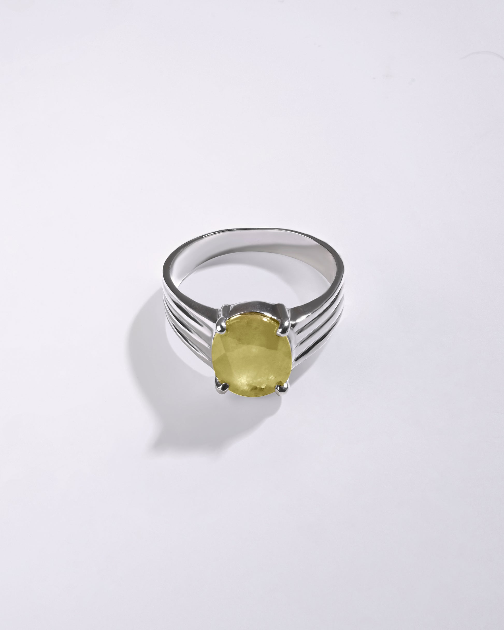 Radiating purity and brilliance, our yellow sapphire ring is set in 925 sterling silver. Known for its golden shimmer, this exquisite gemstone reflects light beautifully, creating a warm and radiant glow. Believed to attract prosperity and success, yellow sapphire is thoughtfully designed to touch your skin, enhancing its astrological energy. Celebrate the perfect blend of elegance and authenticity with a 100% genuine yellow sapphire.